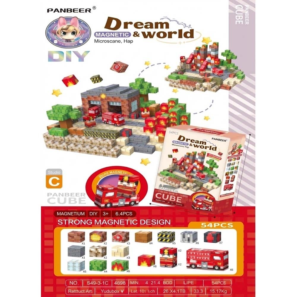 The set consists of 58 pieces, and uses the colors red, gray, and green to build 3D models of a fire station and fire trucks.