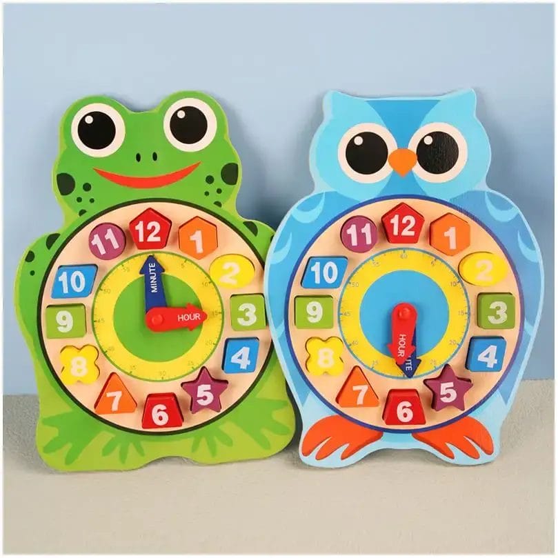 This wooden educational clock for kids features an animal design (frog and owl), featuring moving hands and colorful, sortable numbers. It helps children learn to tell time, recognize colors and shapes, and develop fine motor skills in a fun and interactive way. Suitable for homework or early education classes.
