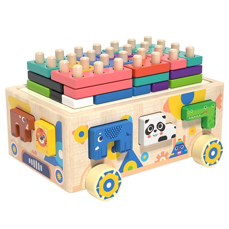 عربة خشبية على عجلات تعمل كلعبة فرز الأشكال وتطابق الأعمدة