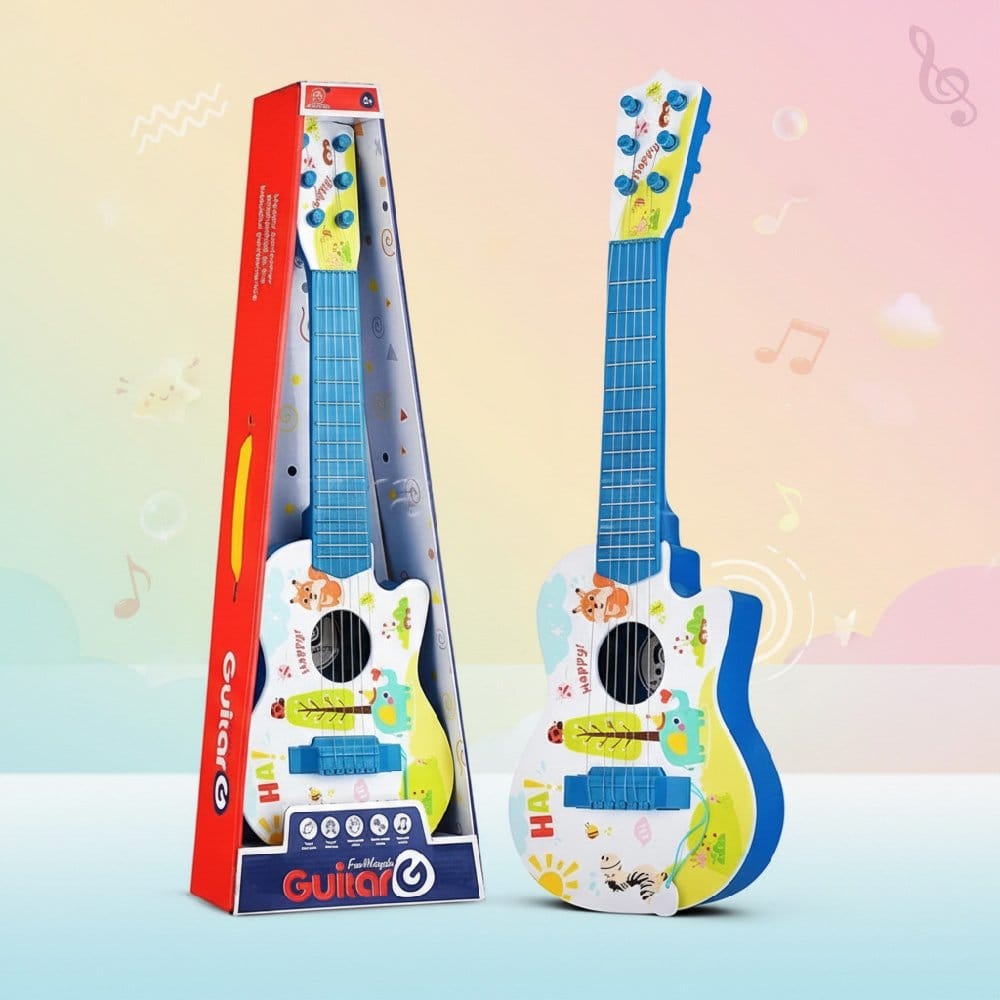 جيتار بلاستيكي مصمم للأطفال برسومات حيوانات وألوان زاهية، وهو مخصص للعب والمحاكاة الموسيقية.