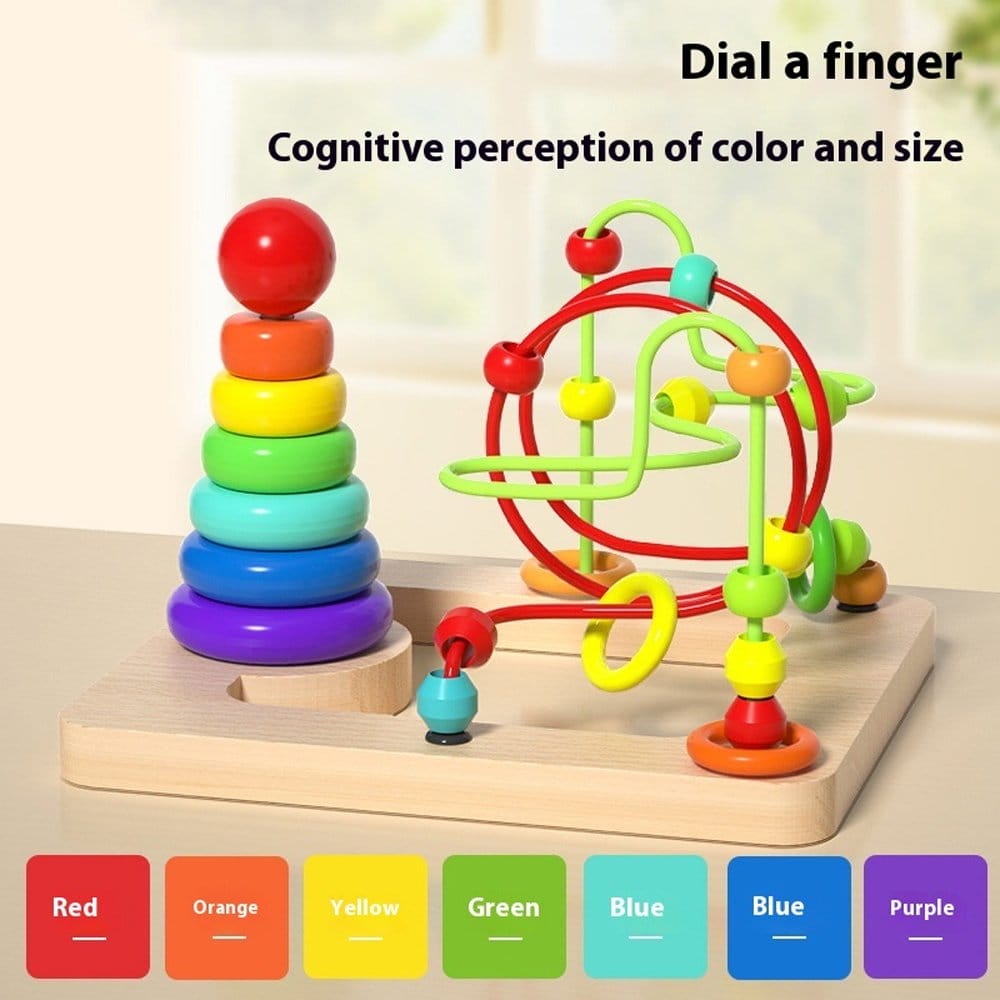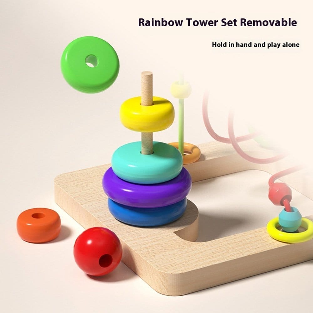 لعبة خشبية تعليمية على قاعدة مربعة تجمع بين برج قوس قزح لتركيب الحلقات حسب الحجم، وممرات خرز سلكية ملتفة لتدريب المهارات الحركية الدقيقة.