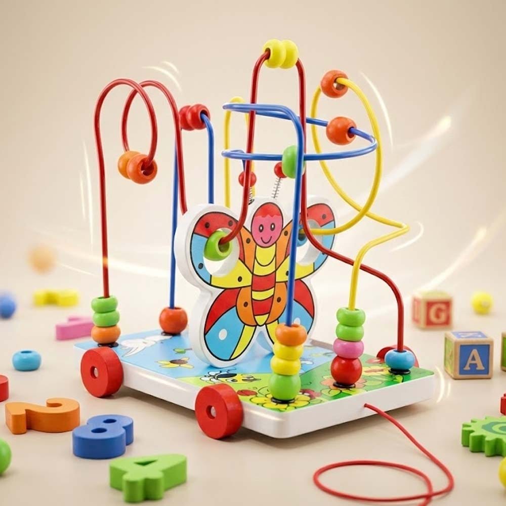 لعبة تجمع بين عربة سحب صغيرة ومتاهة خرز سلكية ثلاثية الأبعاد، بتصميم فراشة مركزية.